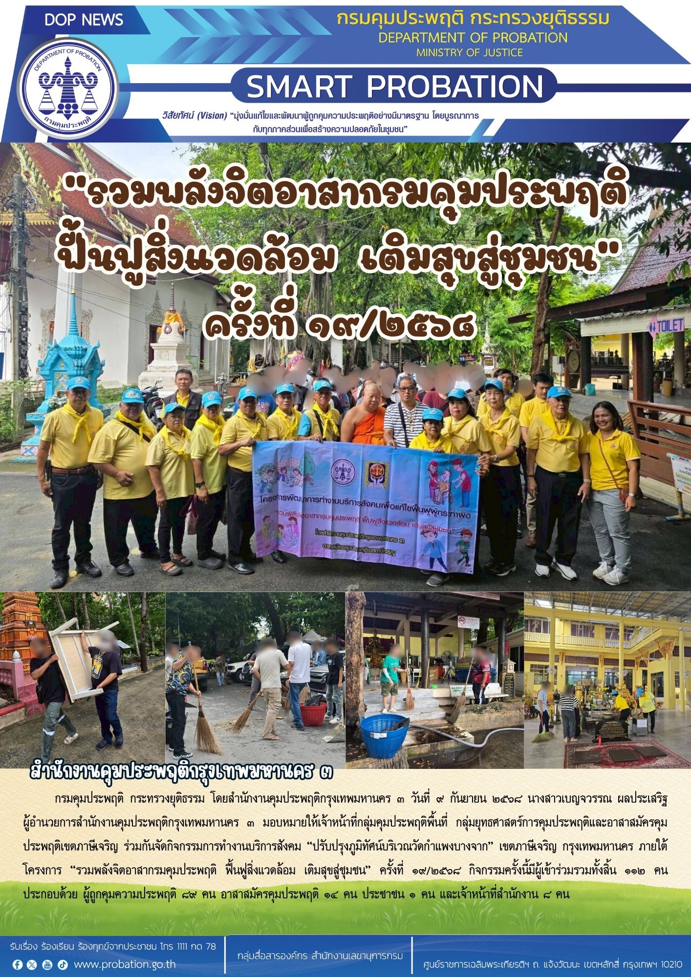 กรมคุมประพฤติ กระทรวงยุติธรรม โดยสำนักงานคุมประพฤติกรุงเทพมหานคร ๓ วันที่ ๙ กันยายน ๒๕๖๘ นางสาวเบญจวรรณ ผลประเสริฐ ผู้อำนวยการสำนักงานคุมประพฤติกรุงเทพมหานคร ๓ มอบหมายให้เจ้าหน้าที่กลุ่มคุมประพฤติพื้นที่ กลุ่มยุทธศาสตร์การคุมประพฤติและอาสาสมัครคุมประพฤติเขตภาษีเจริญ ร่วมกันจัดกิจกรรมการทำงานบริการสังคม "ปรับปรุงภูมิทัศน์บริเวณวัดกำแพงบางจาก" เขตภาษีเจริญ กรุงเทพมหานคร ภายใต้โครงการ "รวมพลังจิตอาสากรมคุมประพฤติ ฟื้นฟูสิ่งแวดล้อม เติมสุขสู่ชุมชน" ครั้งที่ ๑๙/๒๕๖๘ กิจกรรมครั้งนี้มีผู้เข้าร่วมรวมทั้งสิ้น ๑๑๒ คน ประกอบด้วย ผู้ถูกคุมความประพฤติ ๘๙ คน อาสาสมัครคุมประพฤติ ๑๔ คน ประชาชน ๑ คน และเจ้าหน้าที่สำนักงาน ๘ คน