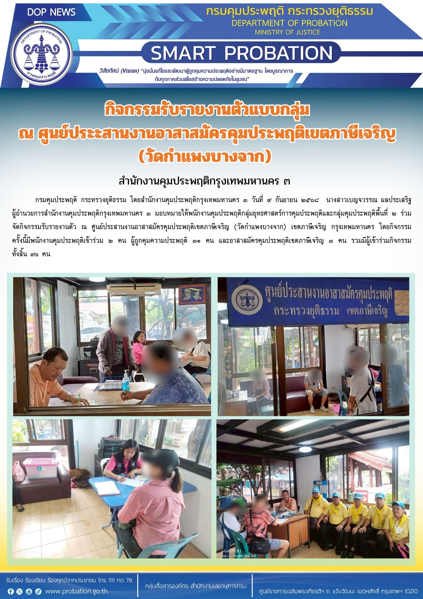 กรมคุมประพฤติ กระทรวงยุติธรรม โดยสำนักงานคุมประพฤติกรุงเทพมหานคร ๓ วันที่ ๙ กันยายน ๒๕๖๘ นางสาวเบญจวรรณ ผลประเสริฐ ผู้อำนวยการสำนักงานคุมประพฤติกรุงเทพมหานคร ๓ มอบหมายให้พนักงานคุมประพฤติกลุ่มยุทธศาสตร์การคุมประพฤติและกลุ่มคุมประพฤติพื้นที่ ๒ ร่วมจัดกิจกรรมรับรายงานตัว ณ ศูนย์ประสานงานอาสาสมัครคุมประพฤติเขตภาษีเจริญ (วัดกำแพงบางจาก) เขตภาษีเจริญ กรุงเทพมหานคร โดยกิจกรรมครั้งนี้มีพนักงานคุมประพฤติเข้าร่วม ๒ คน ผู้ถูกคุมความประพฤติ ๓๑ คน และอาสาสมัครคุมประพฤติเขตภาษีเจริญ ๓ คน รวมมีผู้เข้าร่วมกิจกรรม ทั้งสิ้น ๓๖ คน